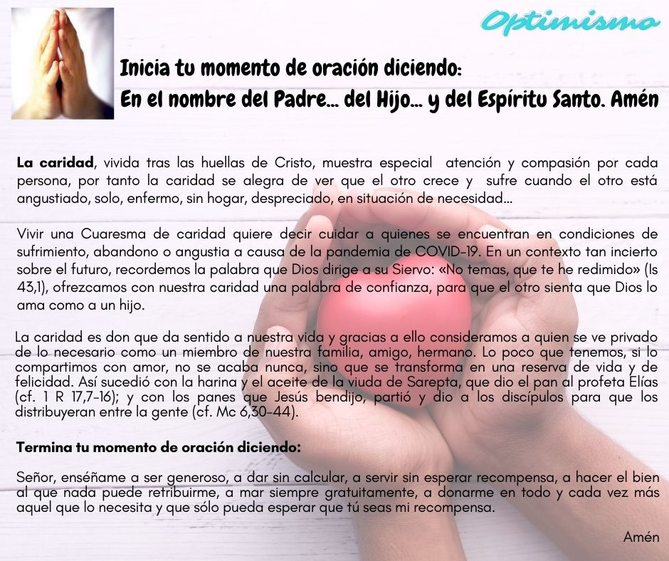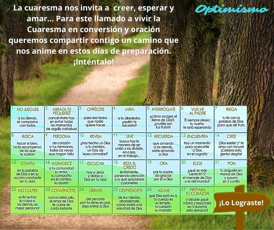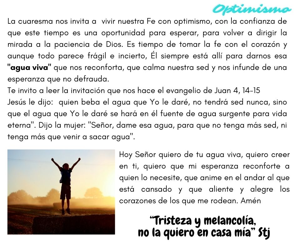Ya iniciamos la Cuaresma, los 40 días de prepararnos para la llegada de Semana Santa y en este tiempo,  el papa Francisco nos hace la invitación de vivirlo de la mano de tres palabras muy importantes: Fe, Esperanza y Optimismo. Asimismo, nuestra Santa Teresa quiere acompañarnos durante este mes con la máxima: “Tristeza y Melancolía no la quiero en casa mía”, ambos nos hacen una invitación especial a iniciar este año escolar con Optimismo, con  fe y con la certeza de que todo va a estar bien. ¡Ánimo!