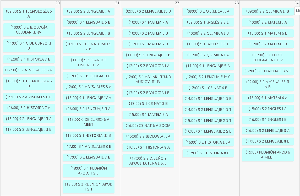 Informamos de los horarios programados de las clases virtuales para algunos cursos durante la próxima semana, desde el día lunes 20 al 24 de julio. Se debe tener presente que los horarios son comunicados  por los profesores tutores de cada curso oportunamente y que están disponibles en webclass para cada estudiante en la sección calendario.