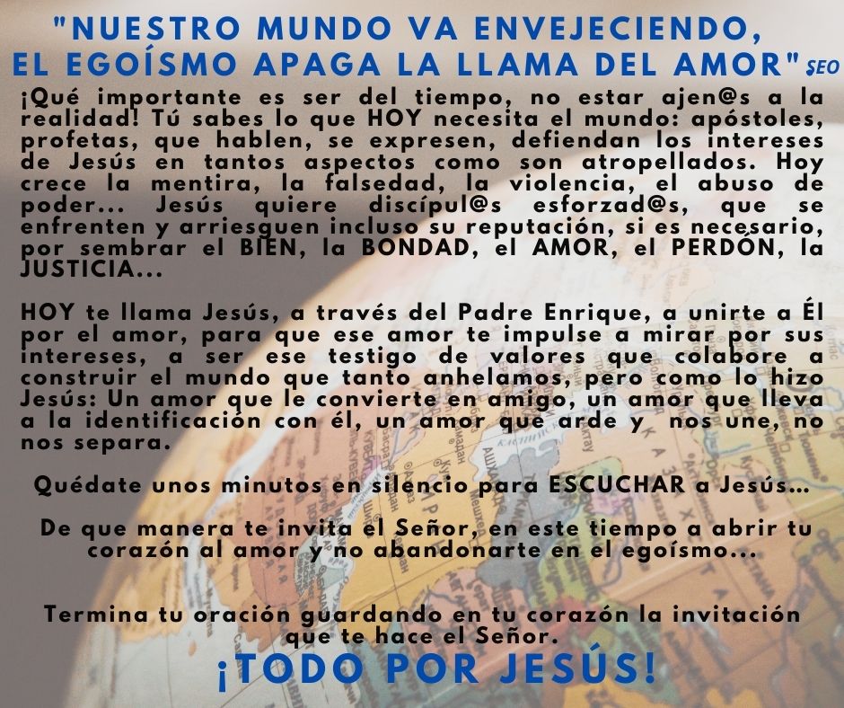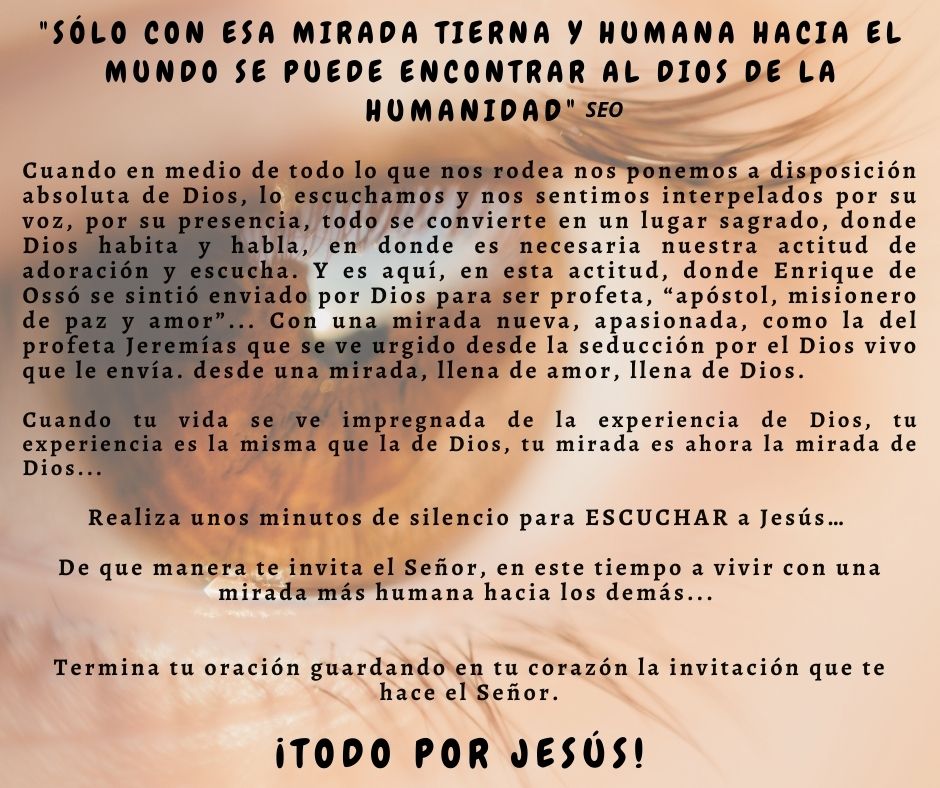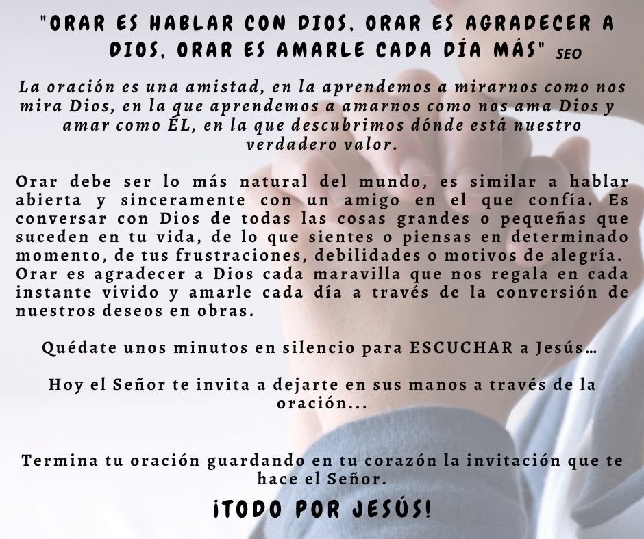 Orar, más que hablar o pensar, es mirar a Jesús y dejarse mirar por Él, salir de nuestro pequeño corazón para mirar el corazón grande de Dios y aprender a mirar el mundo como lo mira Dios.