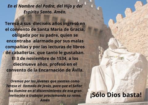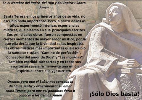 Submitted by sergiooyarzungarcia on Lun, 10/04/2021 - 12:58Durante esta semana reflexionaremos con algunas frases o máximas de Santa Teresa, una “máxima” es una frase de origen popular o culto repetida tradicionalmente, en la cual se expresa un pensamiento, un consejo o una enseñanza.