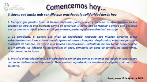 Durante esta semana te invito a reconocer algunas de las formas o maneras en las que podemos ser solidarios, y así, orar con algunos detalles de la vida diaria que van de la mano de la solidaridad, Jesús nos invita a incorporar estas acciones, valores o actitudes en nuestro actuar con quienes nos rodean. Hoy te invitamos a poner en práctica el valor de la Amabilidad.